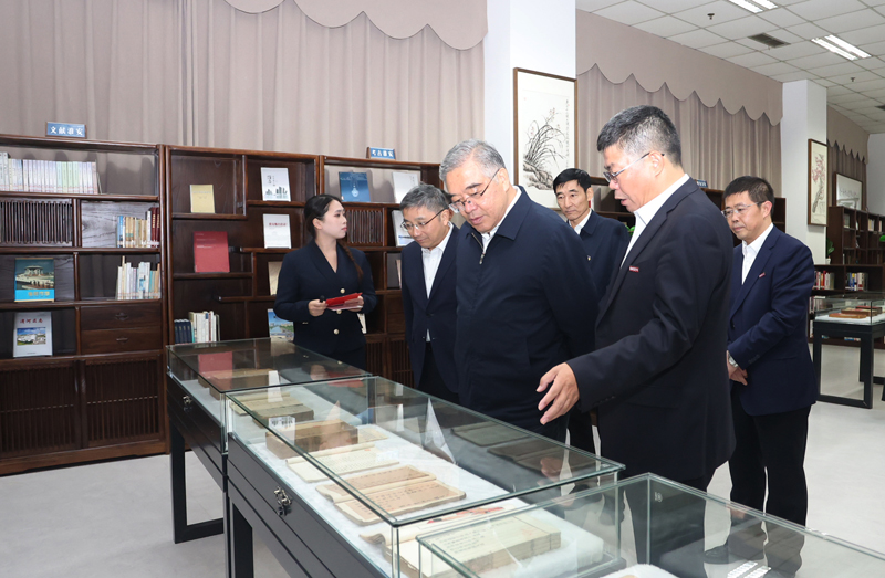 图为朱永新考察“文心阁”特色文库。记者 唐瑀 摄