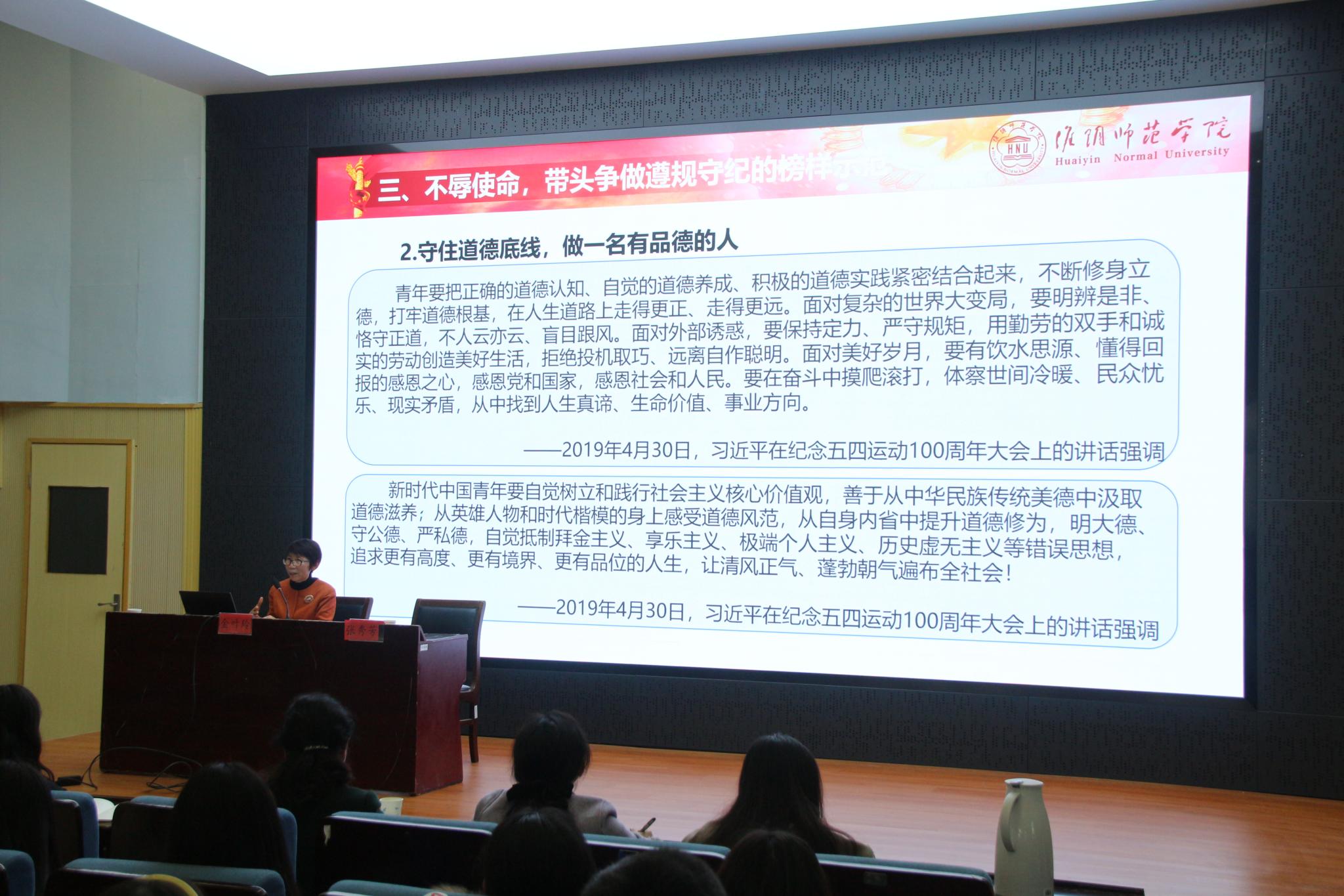 金叶玲以“坚定信念、不辱使命,做遵规守纪的示范者”为题,从坚定信念深刻理解遵规守纪的重要意义、以案为鉴切实增强遵规守纪的思想自觉、不辱使命带头争做遵规守纪的榜样示范三个维度对大学生如何遵规守纪作了讲解。讲座以坚定信念为基础,以鲜活案例为借鉴,以不辱使命的责任为担当,教导青年学生要在心中始终高悬一把纪律法规的利剑,常修从业之德,常怀律己之心,严守纪律规矩,做遵规守纪的示范者。