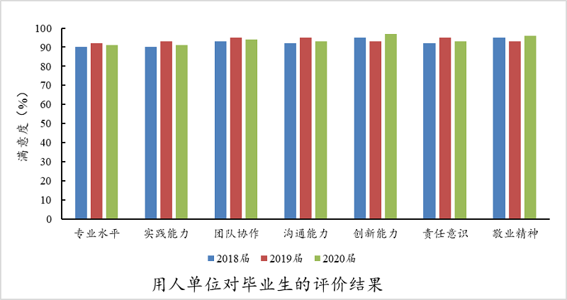 毕业生对母校课程教学、生活服务、创新创业等满意度超99%,对工作满意度85%,对自身发展的满意度超93%;用人单位对毕业生的整体满意度高于91%,尤其是对其动手操作能力、创新能力、沟通交流能力的评价较高。