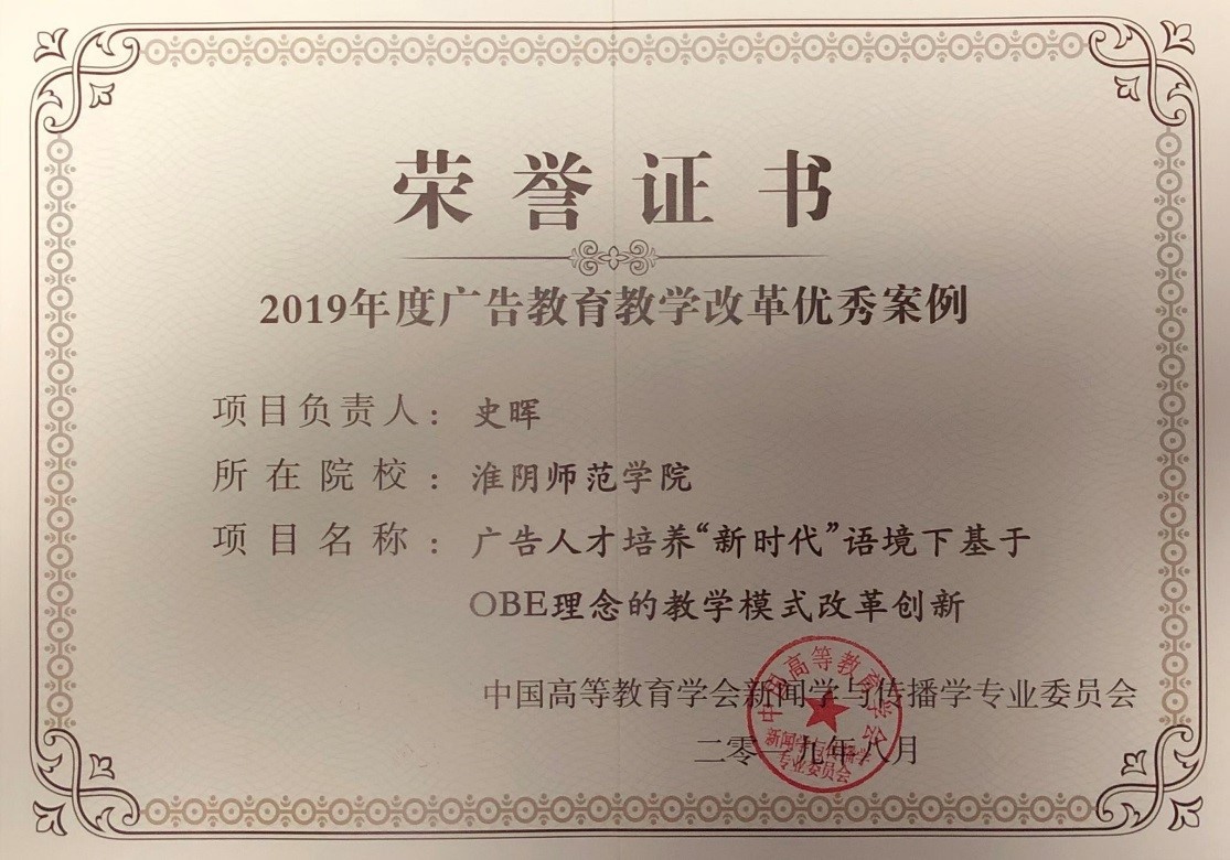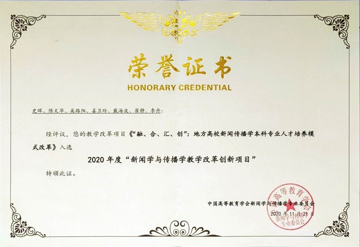 2020年,我院《地方高校新闻传播学本科专业人才培养模式改革》项目荣获中国高等教育学会新闻学与传播学专业委员会颁发的“中国新闻学与传播学教学改革创新项目”奖。史晖院长在中国高等教育学会新闻学与传播学专业委员会第八届理事会第三次会议上就做专题报告,重点介绍了我院应用型人才培养模式改革、新闻传播教学改革以及专业特色发展等情况。