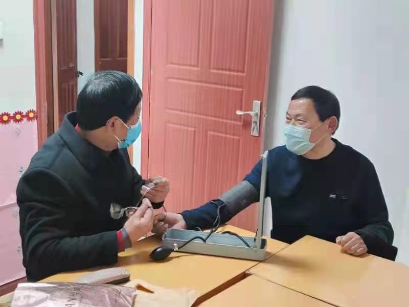 猜谜间隙,淮阴师范学院退休主任医师李浩友为大家测量血压,普及疫情防控常识,提供健康咨询服务。