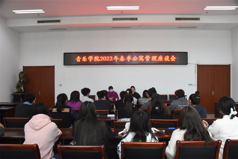 淮师新闻网4月4日电(记者 张瑛鹦)为进一步做好学院学生宿舍安全管理与服务工作,促进学生自律严谨个人品质的养成,近日,音乐学院召开2022年春季宿舍公寓管理座谈会。此次会议由辅导员张瑛鹦老师主持,特邀请学生公寓生活指导老师张素珍阿姨、 薛英阿姨给同学们作指导,院学生会公寓文化建设部全体成员和宿舍长代表参加了本次会议。