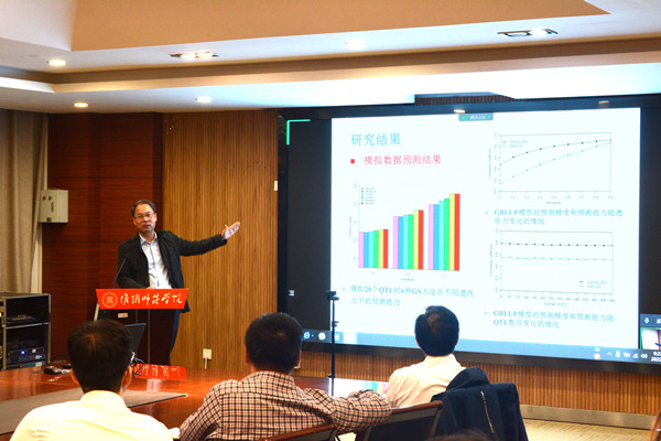 徐辰武教授从研究背景和主要研究内容等2个方面对全基因组选择育种作了详细介绍。在研究内容方面,徐辰武教授根据课题组多年来的研究积累,从全基因组选择方法的研究和应用等方面,对全基因组选择的定义、方法和模型的建立、应用前景进行了精彩讲解,使与会人员对全基因组选择育种技术有了全面而深入的认识,为追踪国际前沿、开展相关研究奠定了基础。