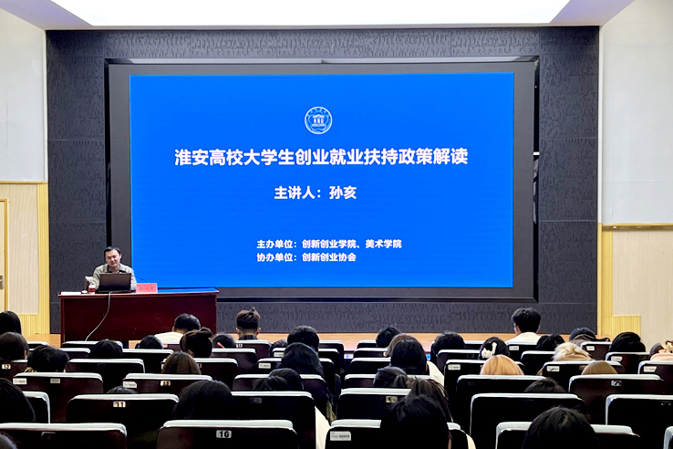 讲座围绕两个层面展开。首先,孙亥从大赛主题、参赛对象、参赛项目、赛程安排、奖项设置等方面对2023年南京都市圈第二届青年大学生创业计划书大赛进行了深入宣讲。其次,孙亥结合淮安市大学生当前创业、就业形势,围绕淮安市创业大赛、大学生优秀创业项目、大学生创业补贴以及担保贷款等方面,详细解读了国家和省、市各级人社部门对创业、就业相关扶持政策。他鼓励大学生要充分了解政策,做好职业生涯规划和求职准备,以良好的心态、积极的热情投入到创业、就业之中,在奋斗中实现个人价值和社会价值的统一。