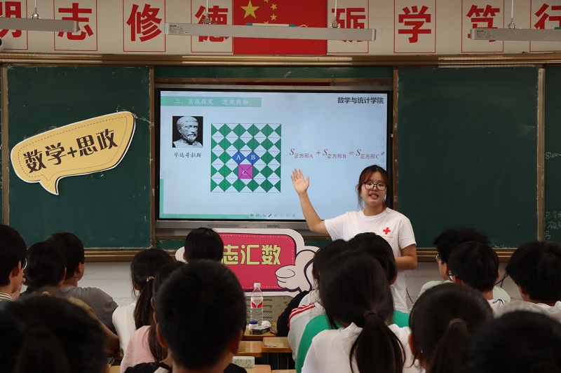数统学院“志汇数”实践团成员走进钱集中学开展数学思政课,给学生讲述勾股定理奥秘的同时,融入了五星红旗的故事,利用网络资源组织开展为期一个月的“志汇数”云课堂,个性化制定孩子的关爱结对方案,为中学生提供线上一对一的思想引领、课业辅导、兴趣培养和心理陪伴等志愿服务。在工农兵社区,成员们与社区小学生畅聊谈心,了解他们在生活、成长等方面遇到的困惑,并结合自身成长经历和体会,为他们答疑解惑。通过大中小学生之间的互动交流,实践团成员实现了知识、技能和情感的传递与共享,思想政治理论课的教学实效性也得以真正落地。