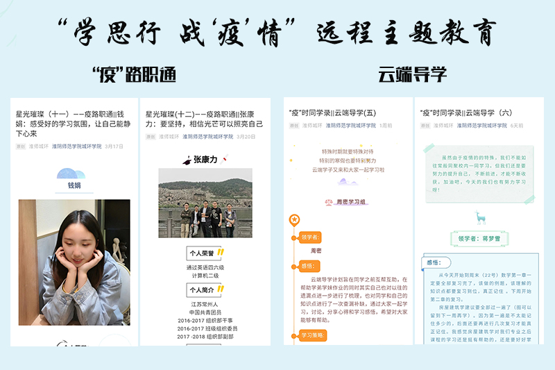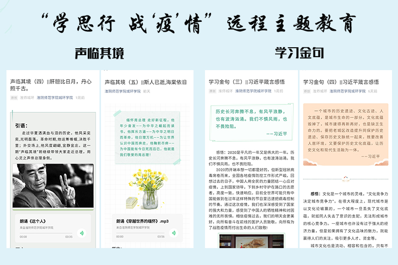 淮师新闻网4月14日(记者 姬广建 王昌澍)为引导同学们科学安排学习生活,理性应对疫情考验,度过一个安全充实的宅居时光,城环学院积极落实好“学思行 战疫情”远程主题教育活动的要求与内容,围绕“学、思、行”三个关键词,引导全体学生主动担当疫时疫刻“修行者”,向真而学,向深而思,向美而行。