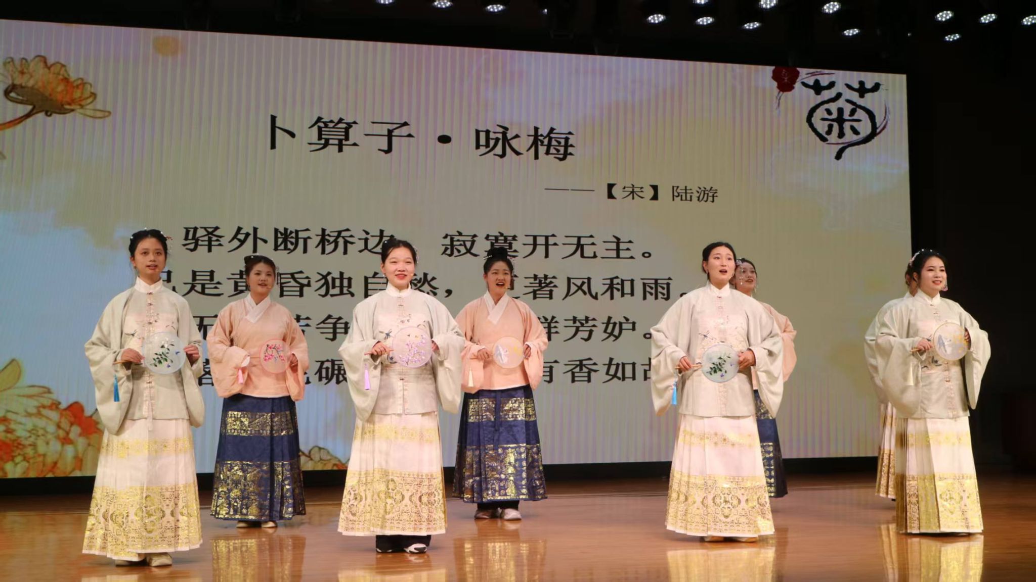 当晚的吟唱展演在新勇学生活动中心学生剧场举行。淮阴师范学院采菊诗社吟唱了《卜算子·咏梅》《清平调三则》与《永遇乐·咏淮上》三首作品。其中,《永遇乐·咏淮上》由张强老师作词、王玮老师作曲,匠心独运地将淮上美景与文化礼赞相融合;《卜算子·咏梅》的古韵与《清平调三则》的现代曲风相映成趣,古筝与笛子合奏旋律婉转清雅,恰如“春风拂槛、露华凝香”。诗社同学以柔美深情的嗓音,娓娓道来“名花倾国两相欢”的绝代风华。三首作品音乐上各具特色,又气韵相连,创新传承了古典诗词精髓,让其真正“活”在当下。活动尾声,全体与会师生齐诵《诗经·小雅·蓼莪》,在古老诗句中凝聚文化认同,深化情感联结。