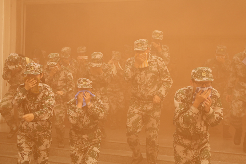 在疏散逃生演练中,崇文楼响起了急促的演练报警声,演练使用的烟雾迅速弥漫场地,全体参演的4000余名同学在教官的带领下捂住口鼻、猫着腰、有序地选择最近的安全出口逃出崇文楼。