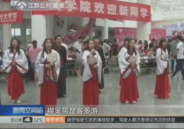 “襟吴带楚客多游,壮丽东南第一州。”这段充满穿越色彩的古诗词吟唱让闹腾的迎新现场吹来一阵清新之风。文学院的学长学姐们大玩古典风,吸引了不少新生和家长驻足。
