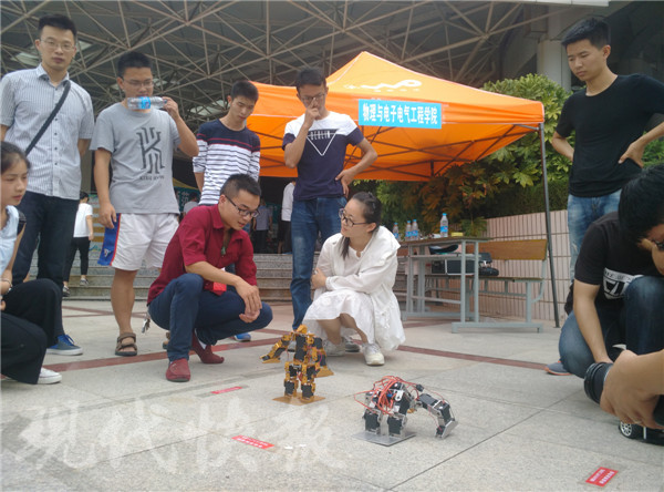 除此之外,音乐学院组织了十个人的管乐演奏队,长裙飘飘,乐声连连;物理与电子电气工程学院学生正在展示他们研制的机器人和无人机;城市与环境学院的学生和老师用地球模型和杠杆来迎接新同学 ……