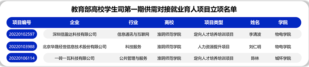 淮师新闻网4月8日电(记者 唐力 王婷)为落实党中央、国务院“稳就业”“保就业”决策部署,深化产教融合、校企合作,推动人才培养与就业有机联动,人才供需有效对接,2021年12月教育部高校学生司实施了供需对接就业育人项目。经前期校企对接沟通和专家论证评审,淮阴师范学院3个项目获得立项。