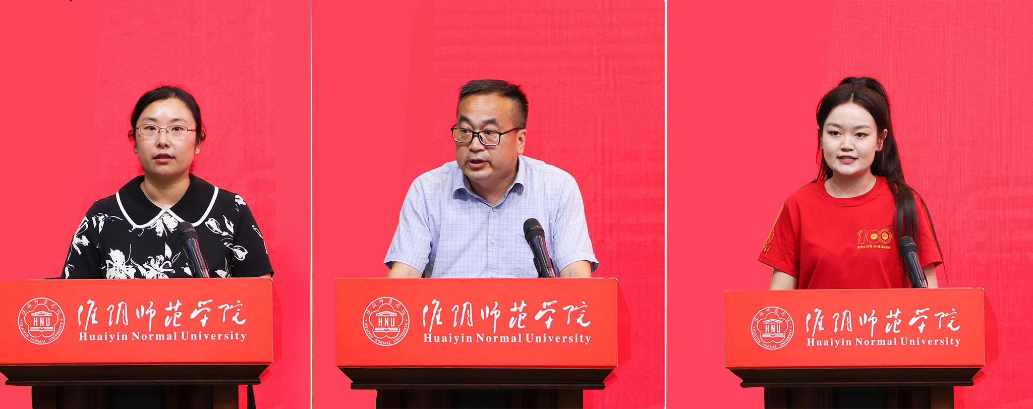 仪式现场,校团委书记纪元宣读《关于组织开展2022年大学生志愿者暑期“三下乡”社会实践活动的通知》。校团委副书记董旭冉介绍今年暑期社会实践基本情况。法政学院《网约车纠纷的基本症候与综合治理——基于2020年江苏省705个案例和徐、淮、苏三市调研的分析》和教科院《区域教育均衡新实践:苏北地区教师职后发展共同体的调查研究》项目负责人进行实践汇报展示。学院团委书记代表、经管学院团委书记黄勉勉,指导教师代表、马院赵国付,社会实践团成员代表、化院陈姿毅分别作表态发言。