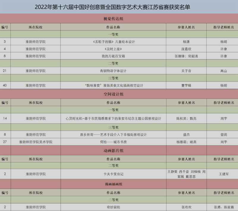 淮师新闻网8月14日电(记者 杨明)近日,第16届中国好创意暨全国数字艺术设计大赛江苏赛区获奖名单正式发布,淮阴师范学院美术学院共有10件作品获奖,其中一等奖4项,二等奖3项,三等奖3项,有6件作品被推荐国赛。