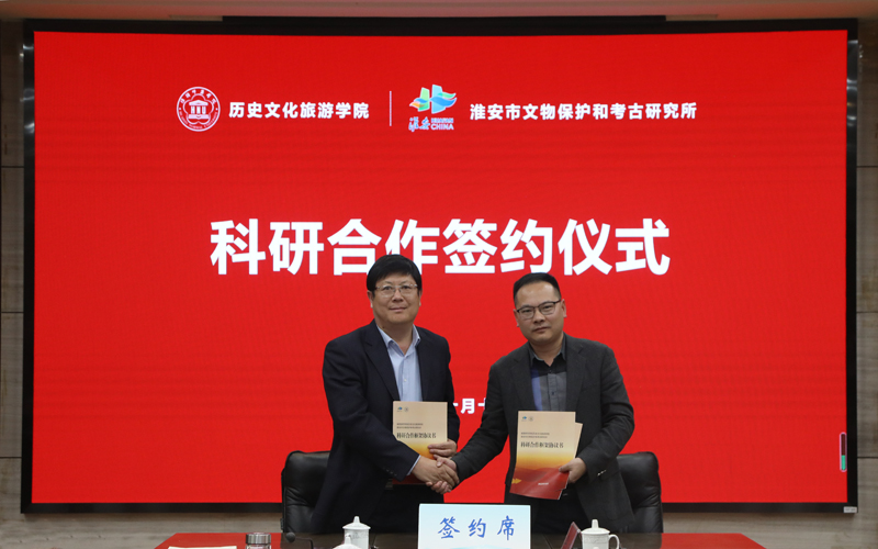 韩同友与许长坡代表双方签署了校地合作协议书;历史文化旅游学院院长房晓军与淮安市文物保护和考古研究所所长胡兵代表双方签订了科研合作框架协议书。今后,双方将在项目开发、文旅研究、人才培养、人员培训、决策咨询、文化创意产业及文化传播等领域开展多层次、多渠道、多形式的交流合作,为淮安经济社会发展和文化淮安事业做出贡献。