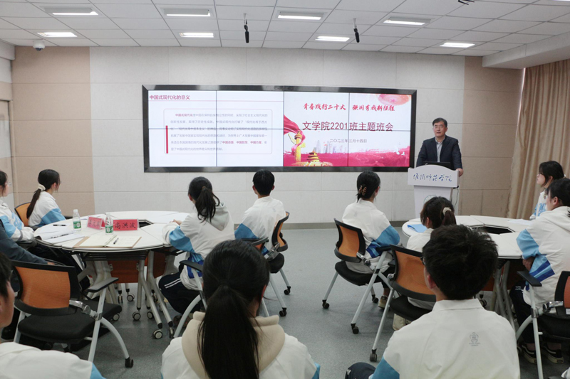 淮师新闻网3月16日电(记者 胡文悦 詹媛媛)为深入学习贯彻党的二十大精神,教育引导广大青年学生为全面建设社会主义现代化国家、实现中华民族伟大复兴的中国梦贡献青春力量,文学院组织各班级开展了“青春践行二十大”主题班会活动。3月14日下午,校党委书记尚洪波应邀参加了2201班主题班会。