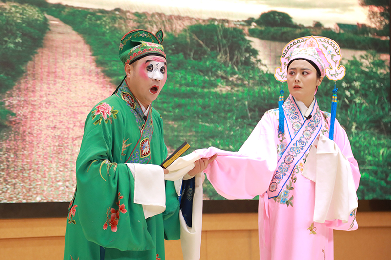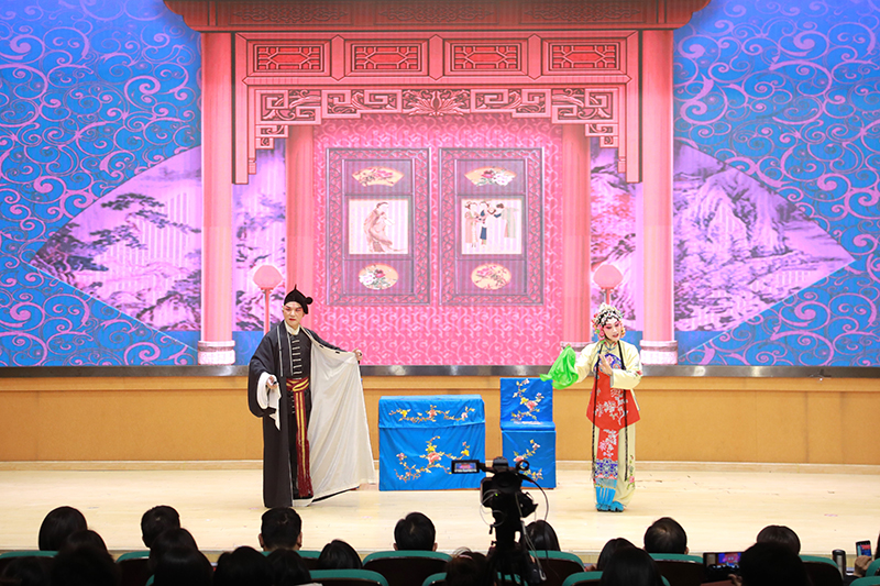 第25届中国戏剧梅花奖获得者许亚玲带领演员们为现场师生带来了一场戏剧艺术盛宴。本次演出的剧目淮海戏《孤岛夫妻哨》,以“时代楷模”“守岛英雄”王继才为原型,以王继才、王仕花欲离岛上岸而最终守岛为核心事件,诠释了夫妻二人“家就是岛、岛就是国”的爱国奉献精神。演员们还为大家带来了红色京剧《沙家浜·军民鱼水情》选段及传统淮海戏《路上行》《打饼》等,赢得全场观众阵阵掌声和一致好评。
