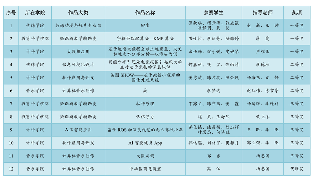自赛事启动以来,学校教务部门积极宣传动员,传媒学院、教科院、计科院、音乐学院等二级学院承办了相应类别的校赛选拔赛。经评审,共推荐35项作品参加省赛,最终12项作品获奖。