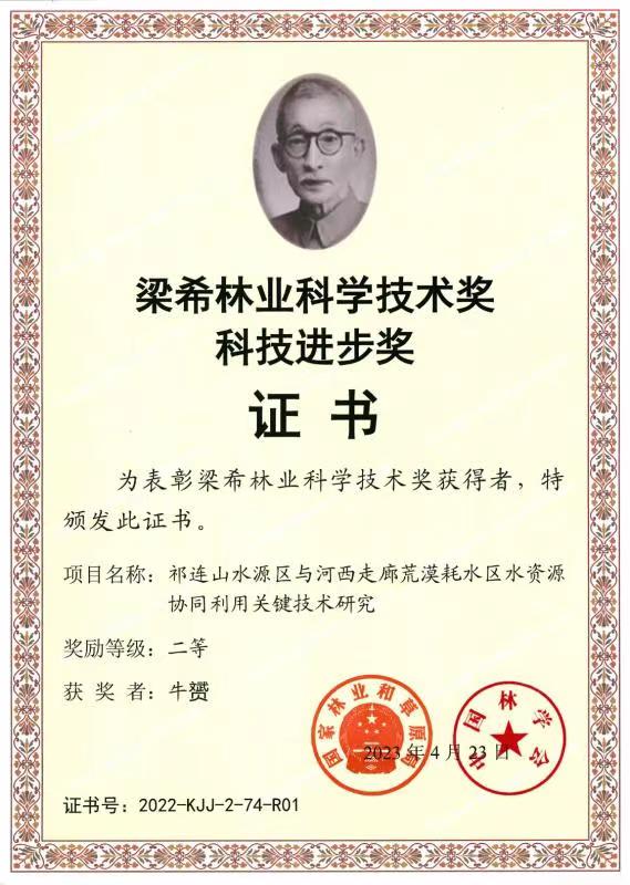 淮师新闻网7月11日电(记者 姬广建)日前,中国林学会公布了第十三届梁希林业科学技术奖评选结果,由淮阴师范学院城市与环境学院牛赟教授主持的科研项目《祁连山水源区与河西走廊荒漠耗水区水资源协同利用关键技术研究》荣获国家林业和草原局梁希林业科技进步二等奖。
