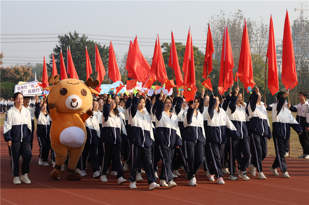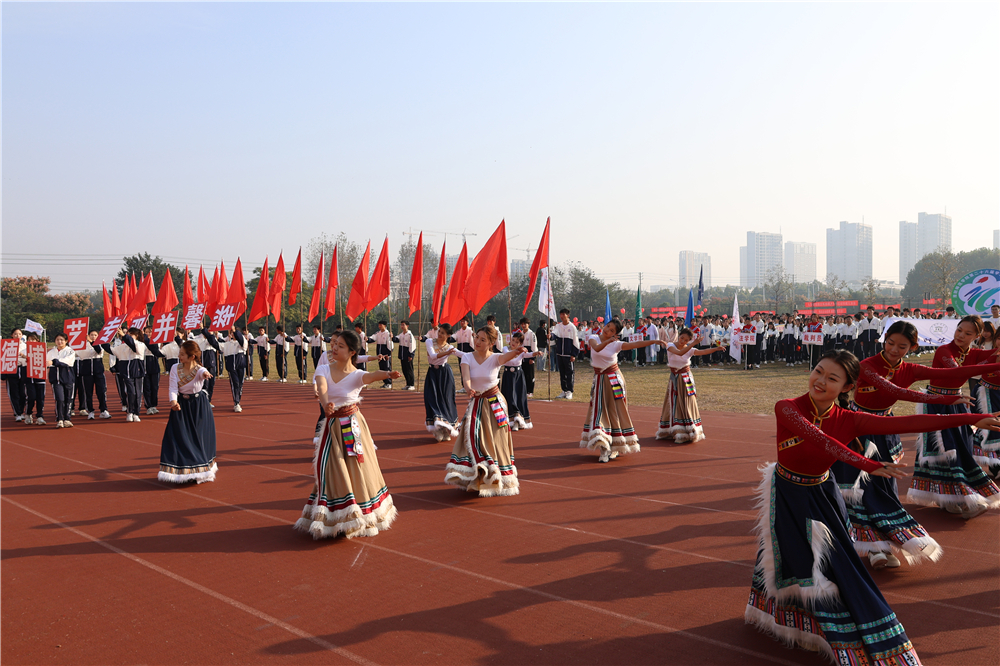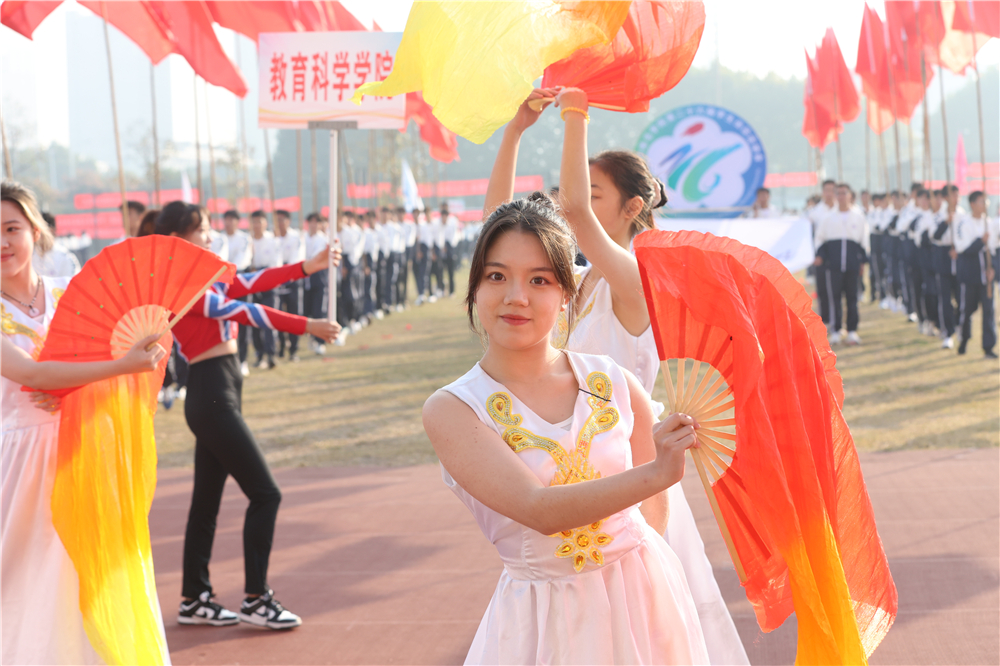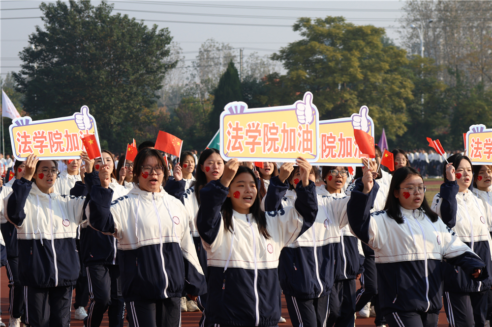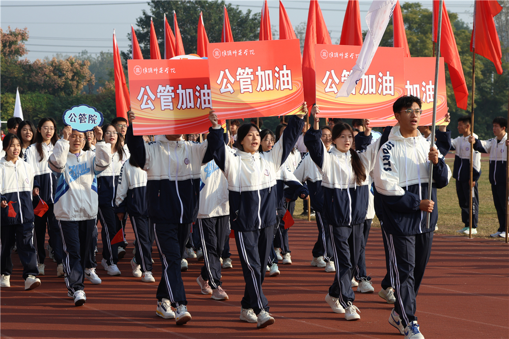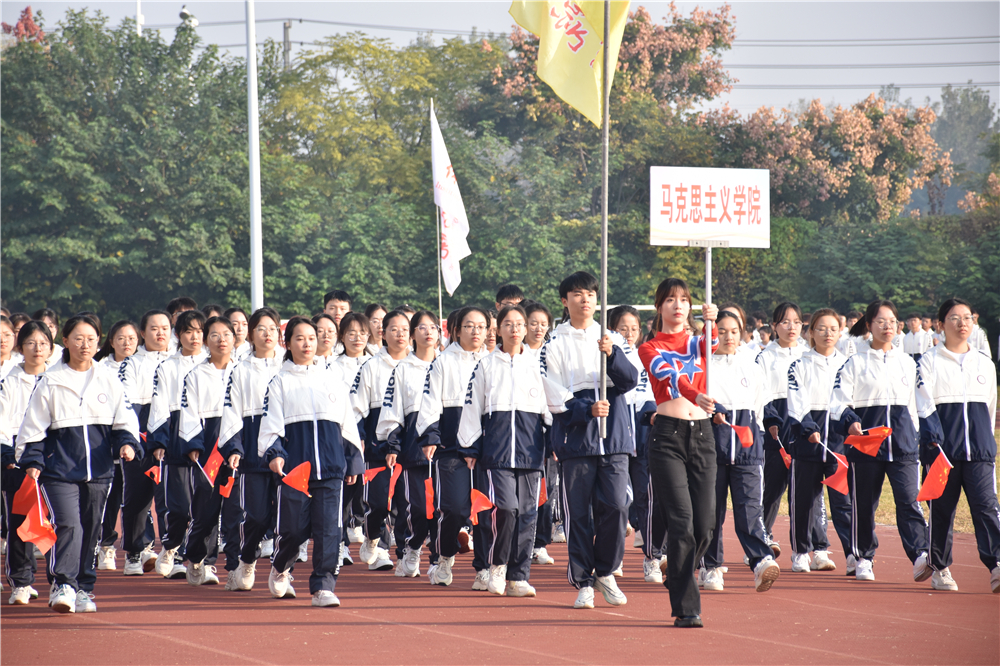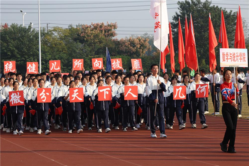 在激进昂扬的运动员进行曲中,国旗、校旗、会徽、彩旗、裁判员、研究生院、各二级学院等方阵依次入场,精神饱满地走过主席台。