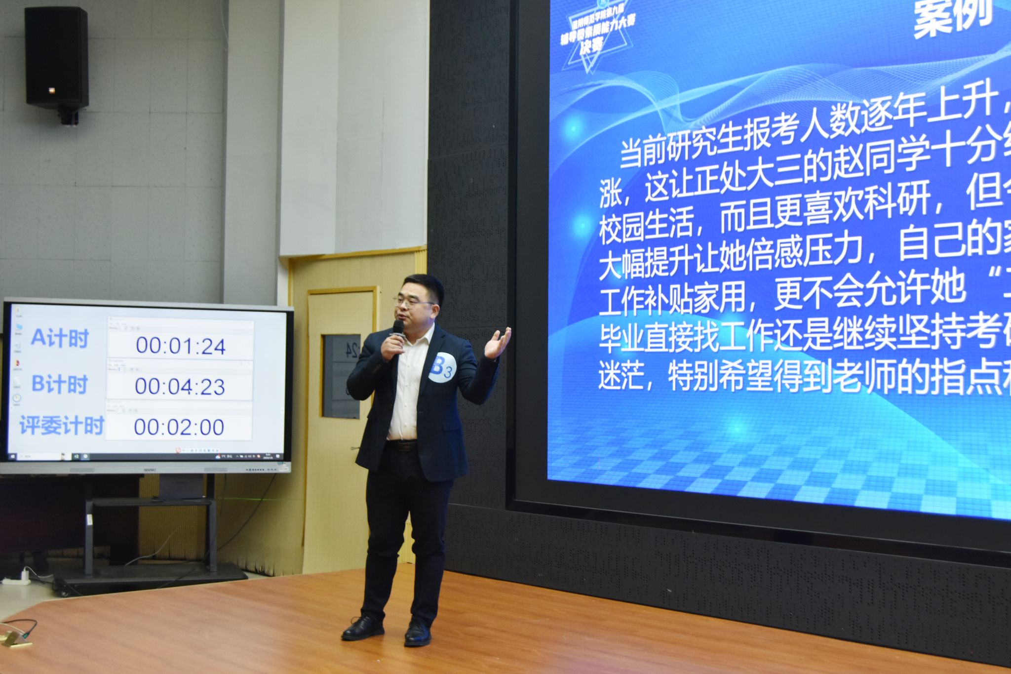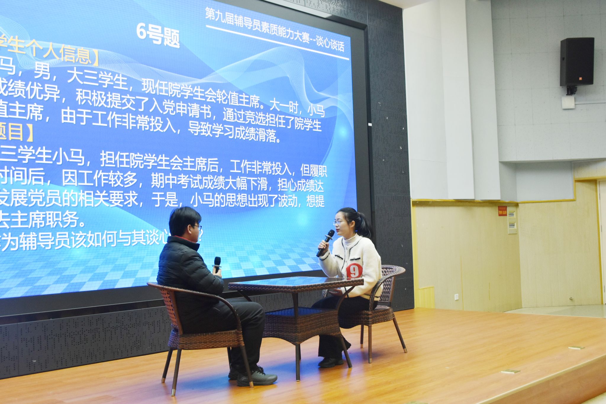 本届辅导员素质能力大赛设置初赛、复赛、决赛三个阶段。决赛由案例研讨、谈心谈话两个环节组成,共10名辅导员参赛。案例研讨环节采用AB角形式,以“你提问,我回答”的方式展开,围绕大学生“心理健康”“职业生涯”“理性消费”“考研指导”等案例,共同辨析原因、研讨对策、总结规律,考察辅导员阐述、分析、研判和解决问题的能力。谈心谈话环节中,参赛选手围绕“网络舆情”“学风建设”“就业指导”“学干培育”等主题,情境再现与学生面对面交流的场景,考察辅导员对学生特点及成长成才规律的了解把握程度、对学生教育引导的能力、解决困惑和实际问题的能力等。决赛过程中,选手们思维敏捷、思路清晰、导向正确,全方位展现了辅导员的个人素养、知识储备、专业技能和工作艺术。