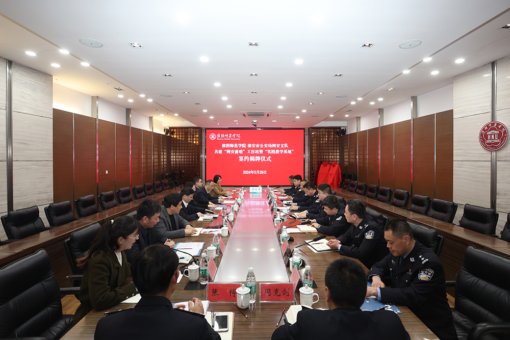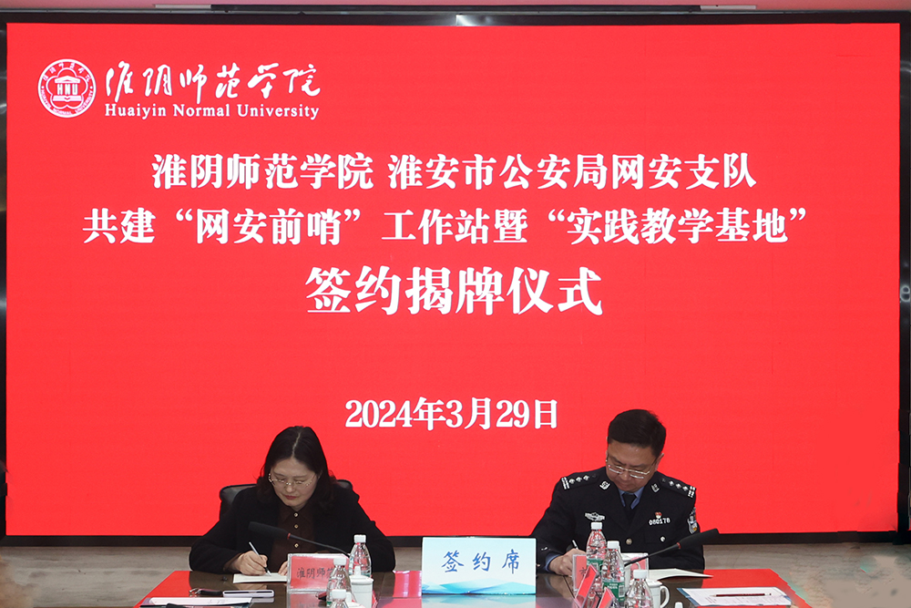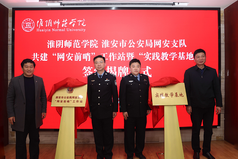 淮师新闻网4月1日电(记者 申珊珊)近日,淮师与淮安市公安局网安支队签订合作协议,并举行共建“网安前哨”工作站暨“实践教学基地”揭牌仪式。党委副书记韩同友,党委常委、宣传部部长管爱花,市公安局网安支队支队长金建宇、副支队长陈震寰,以及校内相关部门单位负责人、网安支队各大队队长、淮阴分局教导员等出席仪式。