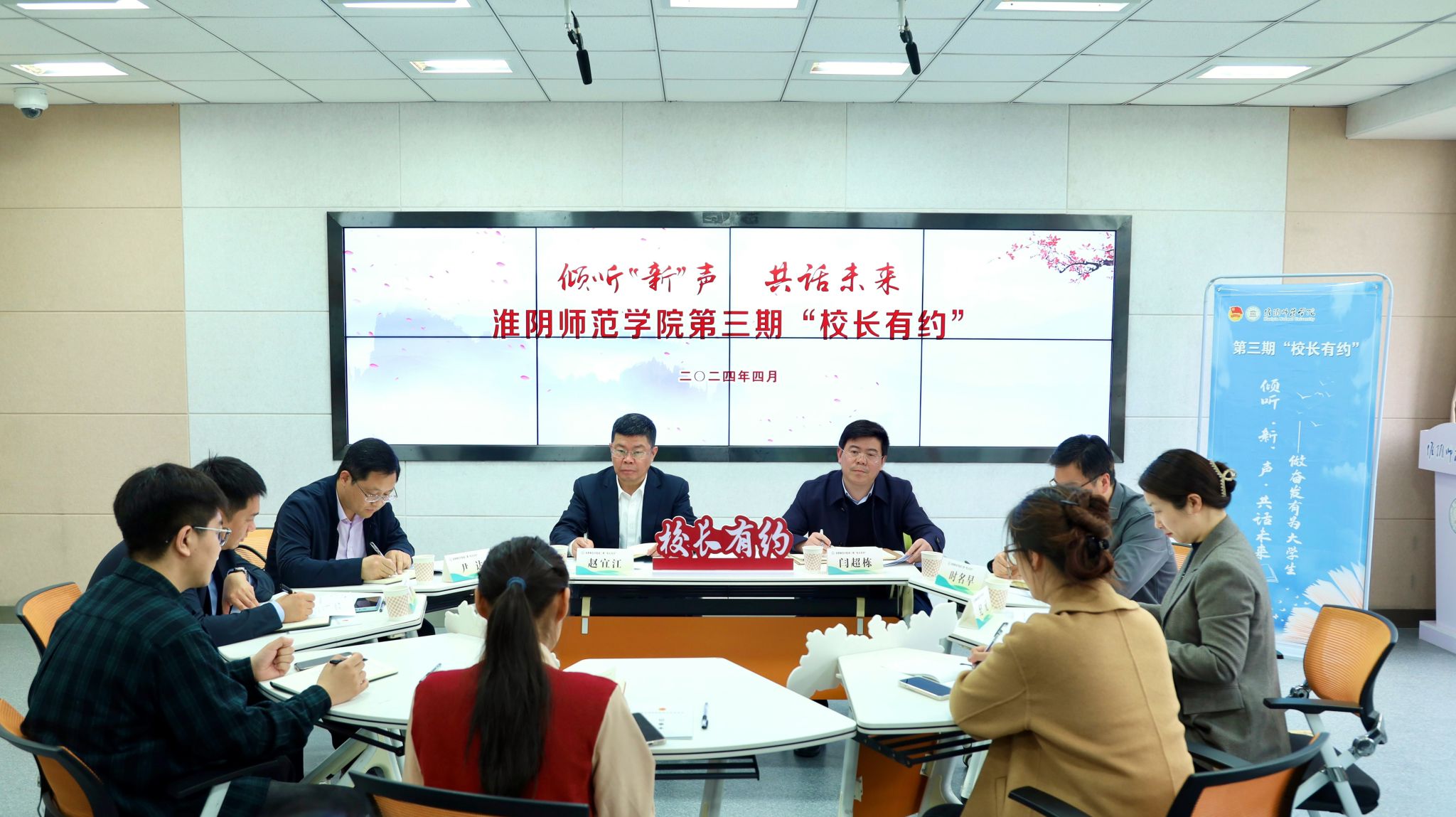 淮师新闻网4月15日电(记者 朱诗瑶)4月12日,淮阴师范学院第三期“校长有约”在崇文楼204智慧教室举行,本期主题为“倾听‘新’声 共话未来”。校长赵宜江、副校长闫超栋出席活动。后勤管理处、保卫处、图书馆、团委等相关职能部门负责人,以及“学生校长助理团”成员代表、2023级本科生和研究生代表参加活动。