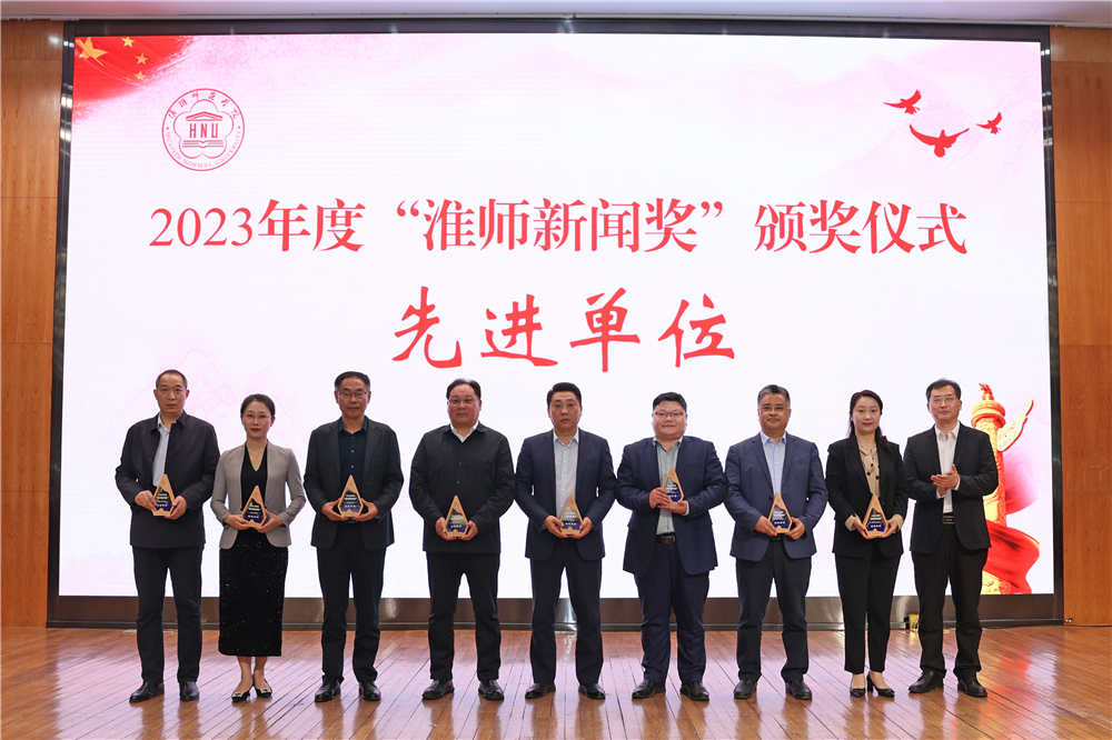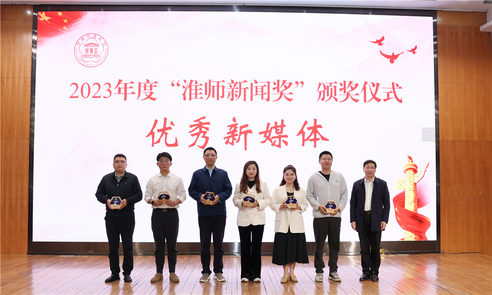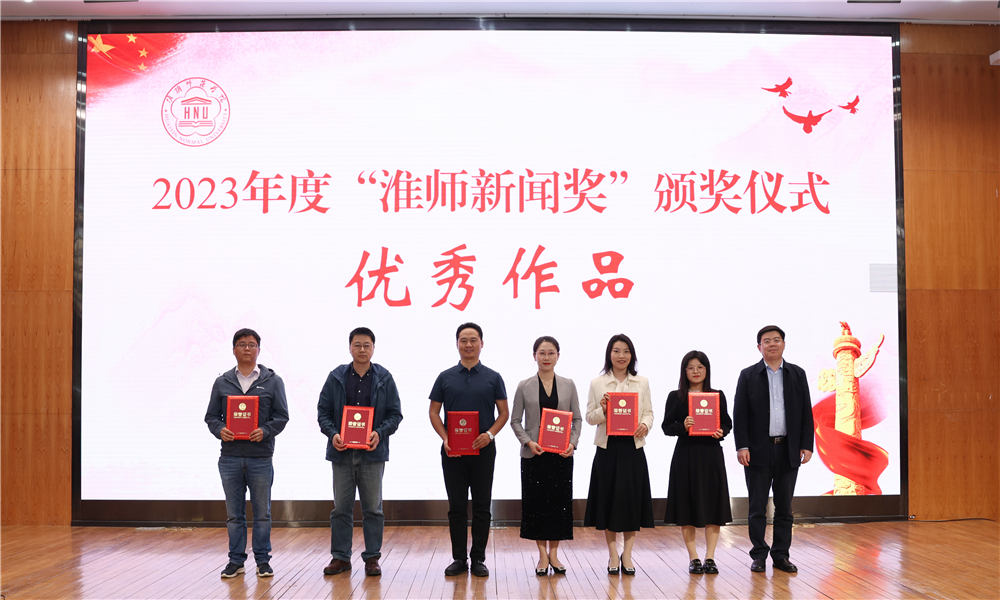 闫超栋宣读了2023年度“淮师新闻奖”表彰决定。与会领导为2023年度“淮师新闻奖”获奖先进单位、优秀新媒体、优秀作品及先进个人颁奖。