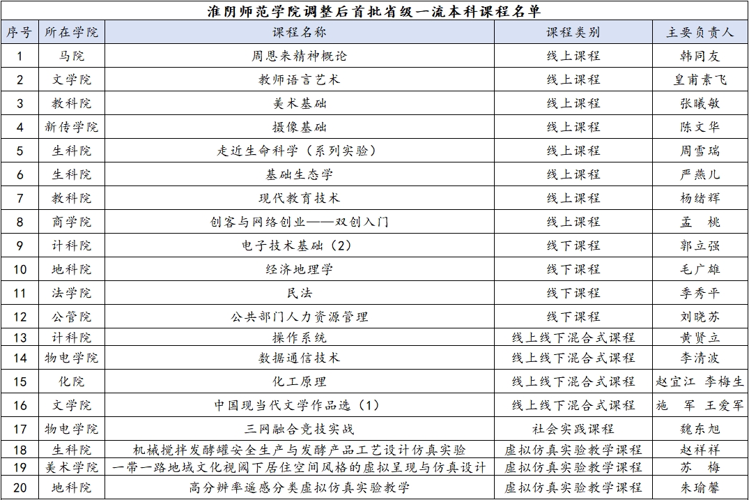 淮师新闻网5月22日电(记者 左宜峥)近日,江苏省教育厅发布《省教育厅关于公布调整后首批省级一流本科课程名单的通知》和《省教育厅关于公布第二批省级一流本科课程认定结果的通知》,公布了首批和第二批省级一流本科课程认定结果,淮阴师范学院2门课程被纳入调整后首批省级一流本科课程名单,7门课程被认定为第二批省级一流本科课程,共9门课程被推荐申报第三批国家级一流本科课程。