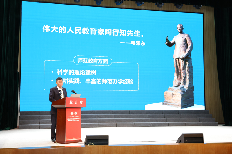 在主旨报告环节,淮阴师范学院党委书记赵宜江以《行知精神引领师范教育变革》为题,从行知精神指明了师范教育的办学方向、行知精神提供了师范教育改革的思路、淮阴师范学院“新师范”建设的实践等三个方面作专题报告。