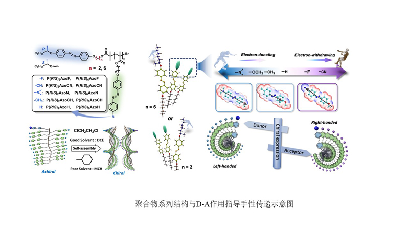 本工作首次通过分子工程,将手性端基与电子可调的偶氮苯侧链相结合,实现了通过取代基电子效应(给电子/吸电子)精准调控超分子螺旋的手性方向。该机制借助偶极矩重新定向及分子间协同作用,控制手性传递过程,可使其按热力学偏好发展、发生反转或呈现多重调控模式进行。该发现深化了聚合物立体化学信息传递机理认识,并为光子学、光电器件及信息编码等响应型手性材料设计奠定了理论基础。