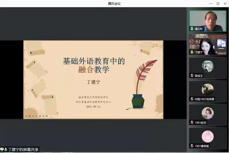 淮师新闻网9月17日电(记者 郭成玉)9月15日下午,外院邀请南京师范大学外国语学院英语系硕士生导师丁建宁教授开展主题为“基础外语教育中的融合教学”的线上学术讲座。会议由外国语学院副院长浦立昕主持,英语师范系全体教师和19级师范专业学生100多人参加了此次讲座。