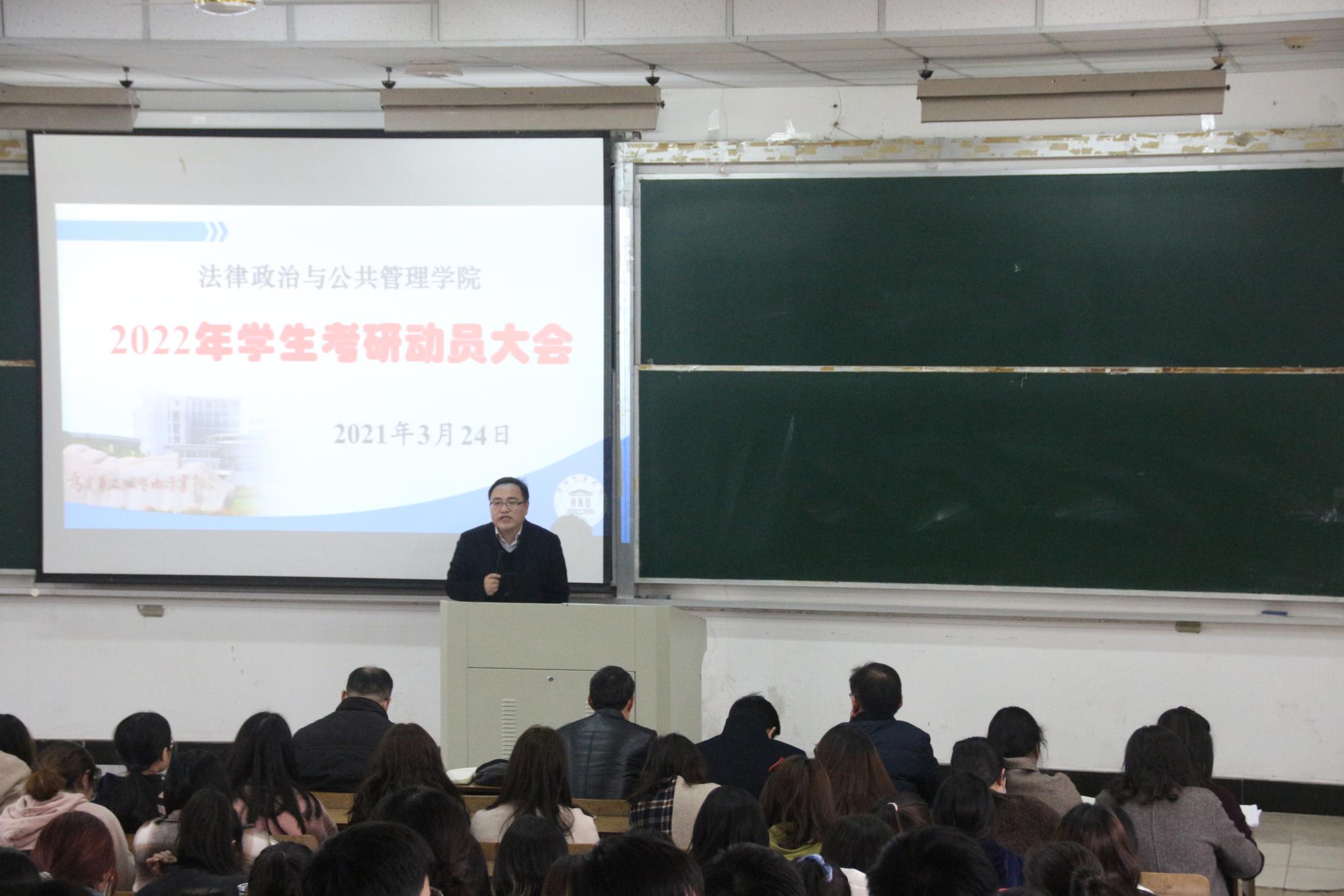 淮师新闻网3月26日电(记者 蒋美琦)3月24日下午,法律政治与公共管理学院在交通路校区综合楼阶梯教室101召开了2022年学生考研动员大会。参加会议人员为2018、2019级全体同学和法政学院全体班主任老师,会议由法政学院副院长张玉磊主持。