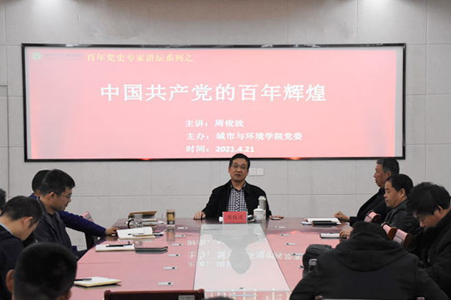 淮师新闻网4月24日电(记者 户玲玲 舒峰 姬广建)4月21日下午,城环学院开展百年党史专家讲坛活动,校关工委副主任周俊波教授带领大家专题学习中国共产党的百年辉煌历史。大会由院党委书记姜于主持,院全体教师党员参与学习。